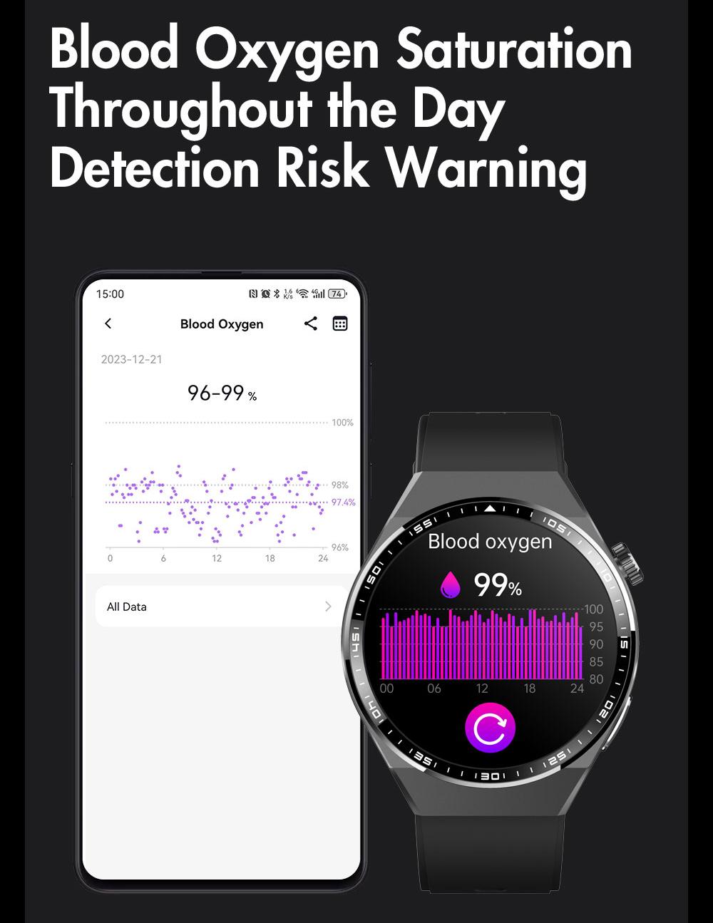 The CareMax smartwatch includes an upgraded, independent blood oxygen sensor that uses nano-level infrared light to detect blood oxygen saturation (SpO2).