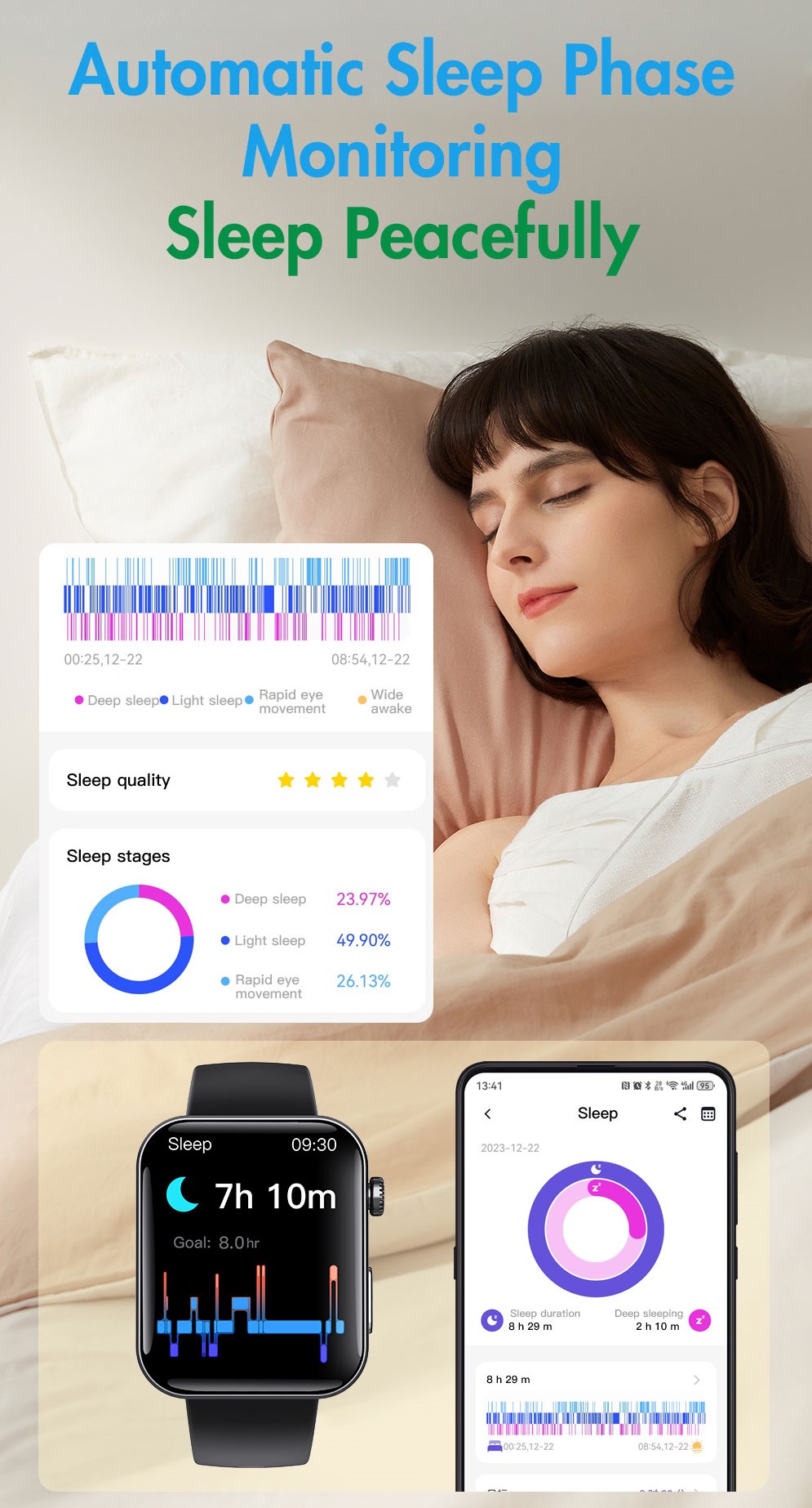 If you have trouble sleeping, PulseMax Powerful Health smart watch adding the breathing training function to help you sleep. In just a few seconds, It immerses you in breathing exercises in the easiest way to improve your health and correct your breathing.PulseMax also helps monitor your sleep by tracking metrics such as duration, breathing rate, and wake-up frequency. It differentiates between light and deep sleep stages, assisting you in improving sleep habits and enhancing sleep quality. This feature effectively supports addressing issues like insomnia and sleep apnea.